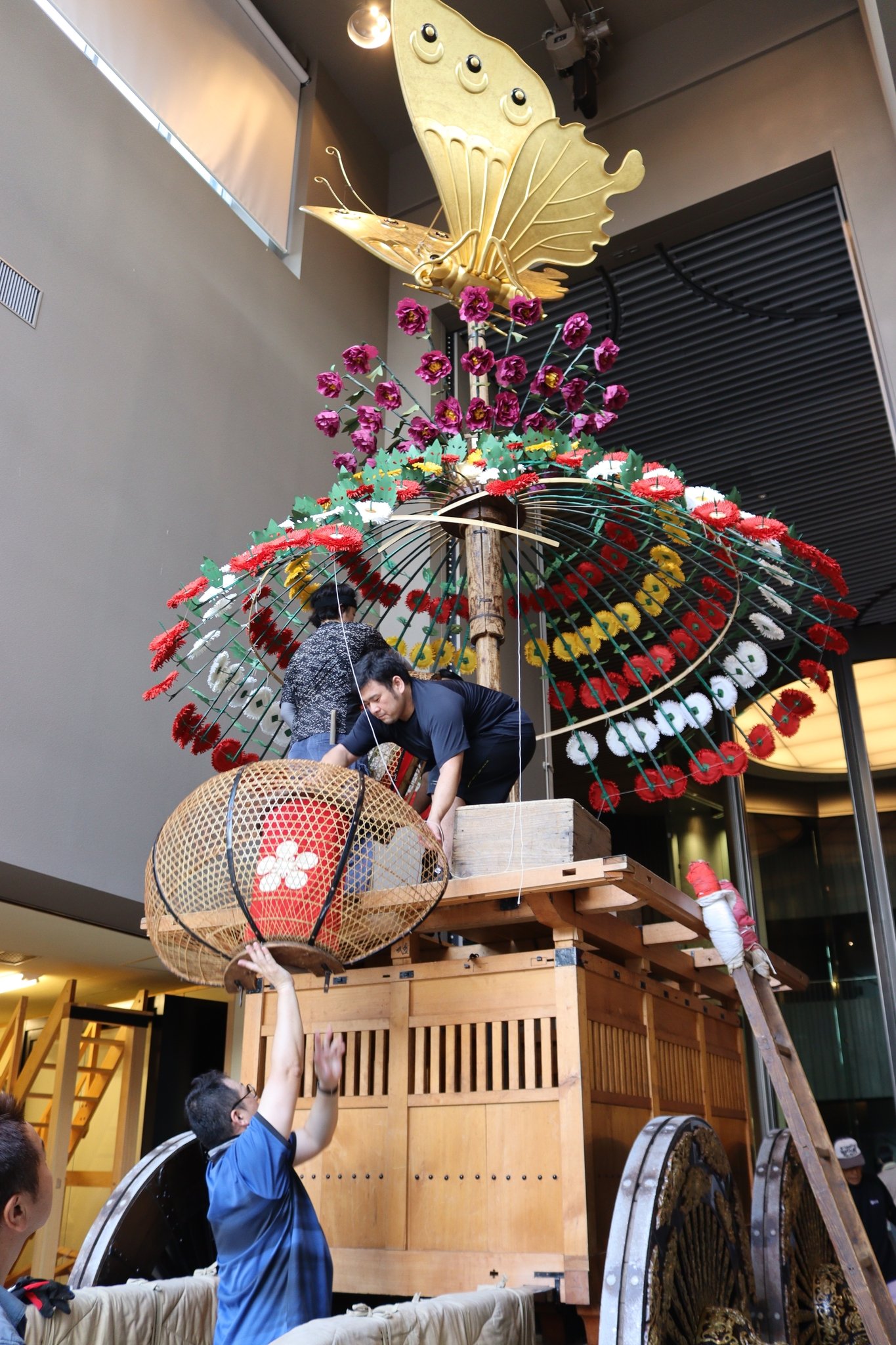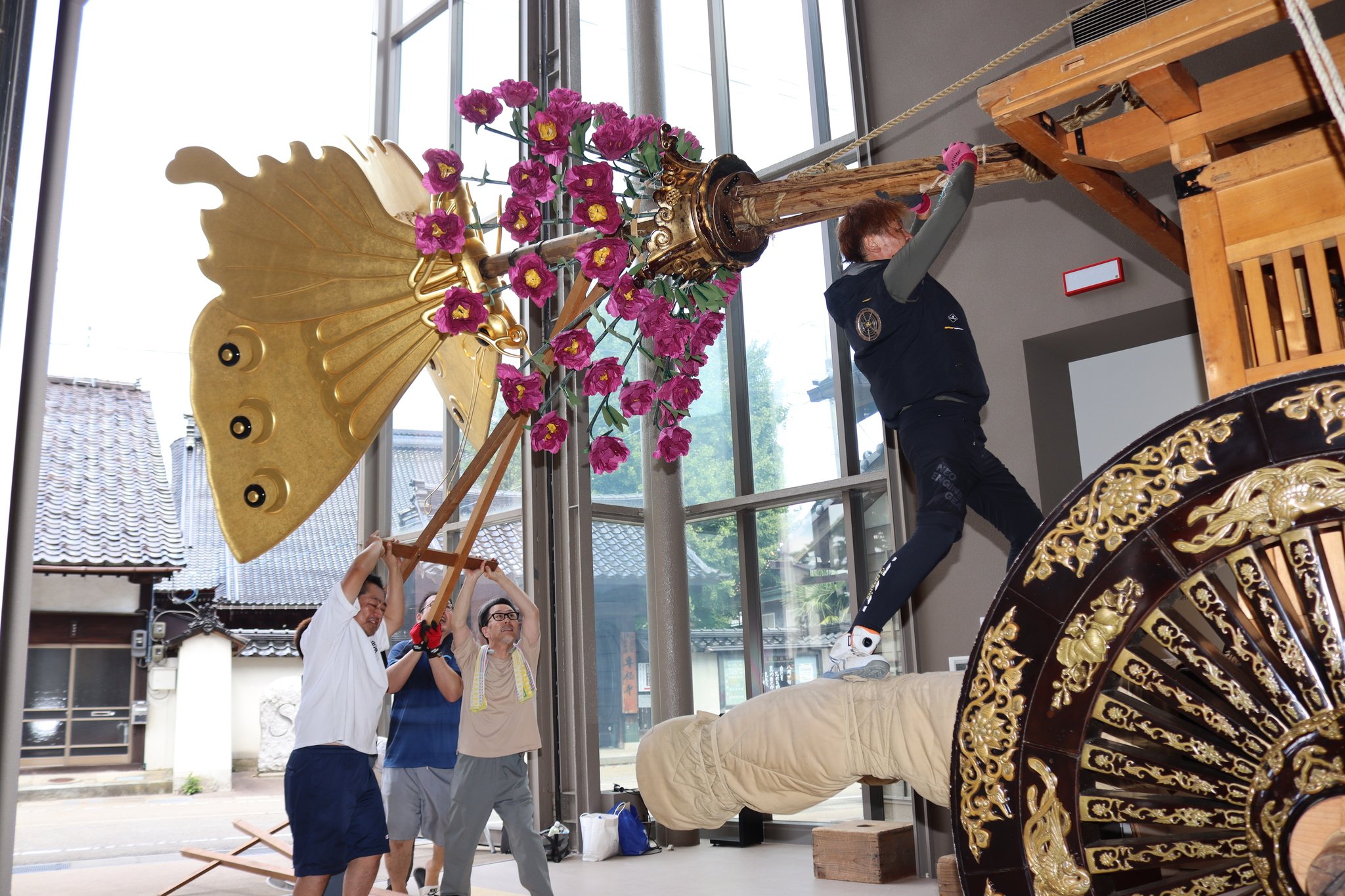 31日は木舟町の住民ら約30人が朝から組み立て作業を行った。心柱に胡蝶の鉾留(ほこどめ)とボタンの高花を飾り付け、「せーの」「よいしょ」と声をかけ合いながらロープを引いて心柱を立てた。