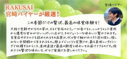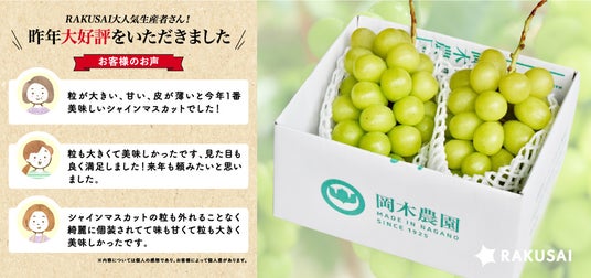 楽彩株式会社(本社:東京都足立区/代表取締役社長:大崎善保)は、長野県にある岡木農園が丹精込めて育てた「至高のシャインマスカット」を、2025年9月1日(月)10:00より公式オンラインショップにて販売開始いたします。