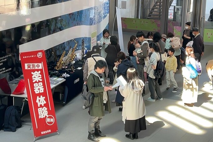管楽器、電子ドラムなど多彩な楽器に触れて体験できるコーナー。