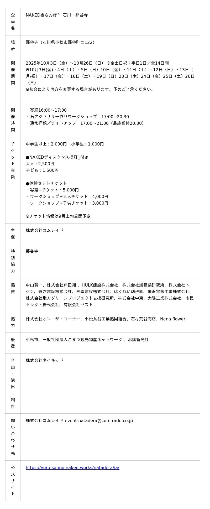 株式会社ネイキッド(英語表記:NAKED, INC. 所在地:東京都渋谷区、代表:村松亮太郎)は、株式会社コムレイドと共に、石川県小松市の名刹・那谷寺を舞台とした特別体験型ツアーならびにナイトウォークイベント『NAKED夜さんぽ(TM) 石川・那谷寺』を、2025年10月3日(金)~10月26日(日)の期間限定で開催いたします。