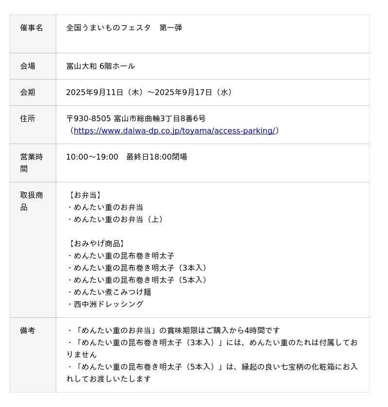 元祖博多めんたい重株式会社は、9月11日(木)から9月17日(水)まで7日間限定で、富山大和にて開催される催事「全国うまいものフェスタ」に初出店いたします。