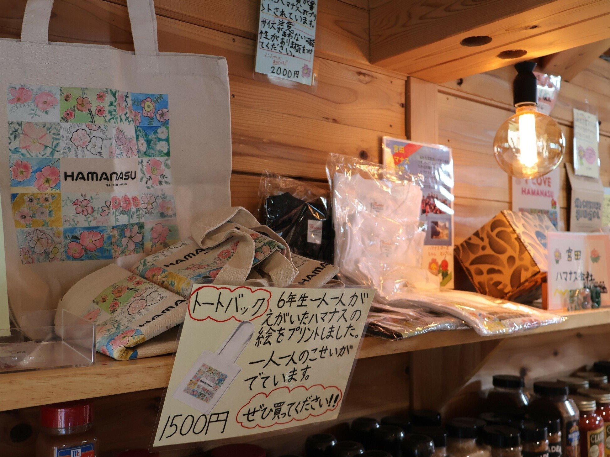 富山県の氷見市宮田小学校6年生は10日、ハマナスをモチーフに製作したTシャツやトートバッグなどを委託販売するため、同市十二町の観光農園「39フルーツパーク」に商品を陳列した。