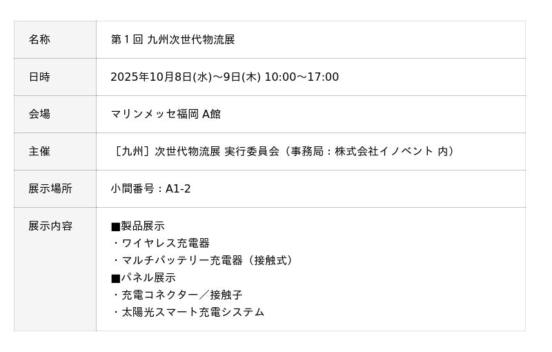 レシップのブースでは、ワイヤレス充電器や大容量のマルチバッテリー充電器などの実機展示に加え、実際の製品を用いた自動充電デモンストレーションも行います。ぜひこの機会に、当社の技術をご覧ください。