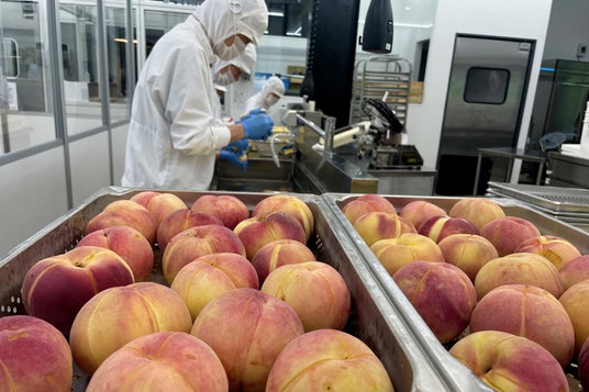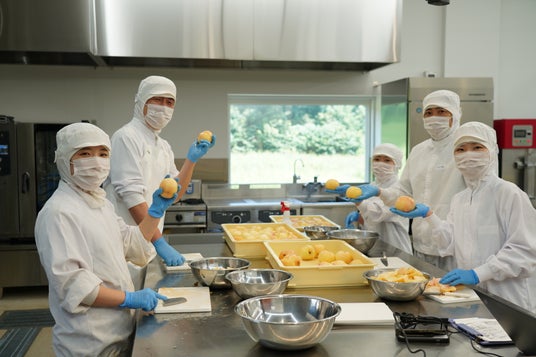 桃の溢れる果実感をジャムに閉じ込めました8月に旬を迎える信州産の桃「あかつき」の香りが強くなる食べごろのタイミングでジャムづくりを実施。商品開発ラボには、商品開発に関わる10人が集まり製造を行いました。約100kg の桃を一つひとつ丁寧に湯むき・種取り・果肉がほどよく残る大きさをイメージして大き目にカットし、種のまわりの果肉も余すことなく絞り加えました。
