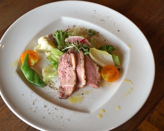 飯綱産の合鴨胸肉をはちみつでやさしくマリネし、低温でじっくり火入れすることで、しっとり柔らかく仕上げました。
