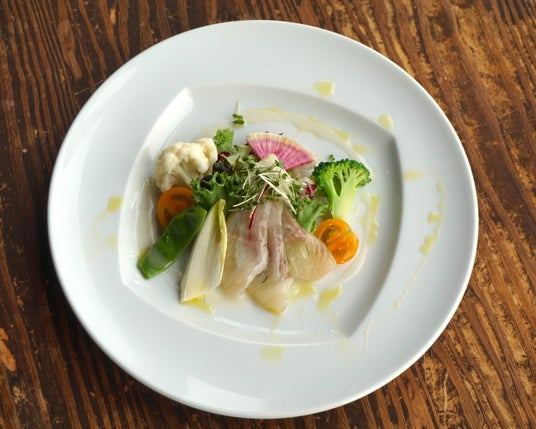 信州の清流育ち、大王岩魚を丁寧にスモーク。白身の上質な味わいを旬野菜とヴィネグレットで引き立てた一皿。
