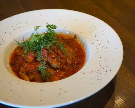 信州福味鶏のもも肉を香味野菜とじっくり煮込み、赤ワインビネガーの酸味とコクが調和した、