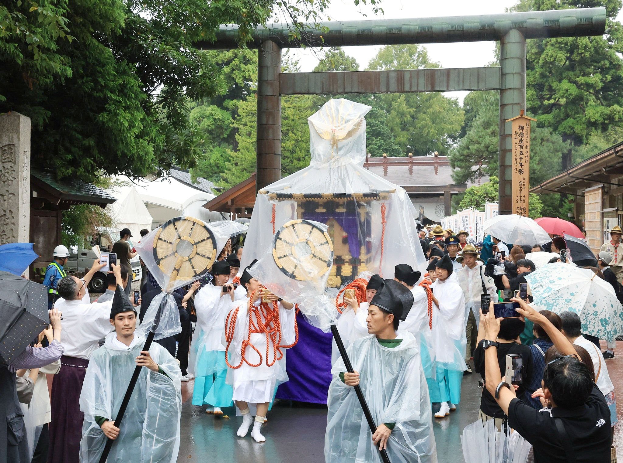 出発に先立ち、同神社で「出輦祭(しゅつれんさい)」があり、炭谷淳宮司が祝詞を奏上し、菅野克志式年大祭奉賛会長らが玉串をささげた。分霊を御鳳輦に移す「奉遷の儀」が厳かに執り行われた後、巡行が始まった。