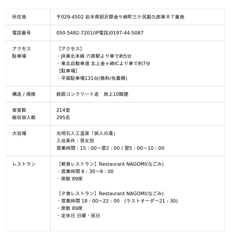 JR東北本線 六原駅から車で約5分、東北自動車道 北上金ヶ崎ICから車で約7分に位置し、北上金ケ崎工業団地をはじめとする周辺エリアへのアクセスにも便利な立地で、ビジネス利用に最適なホテルです。自慢のバイキング朝食や光明石人工温泉を備え、快適なご滞在をサポートいたします。