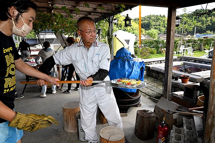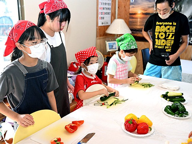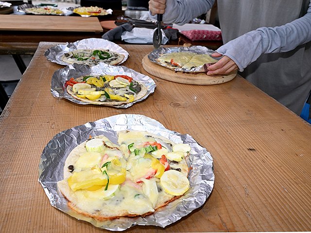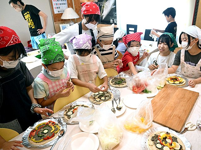 児童は高校生に教わりながら、ピザソースの代わりに、調味料の一種「ひしお」をすり身に混ぜて生地に塗り、その上に自分たちで切ったピーマン、パプリカ、ズッキーニなどをトッピング。まきのピザ窯に入れて焼きたてを味わった。