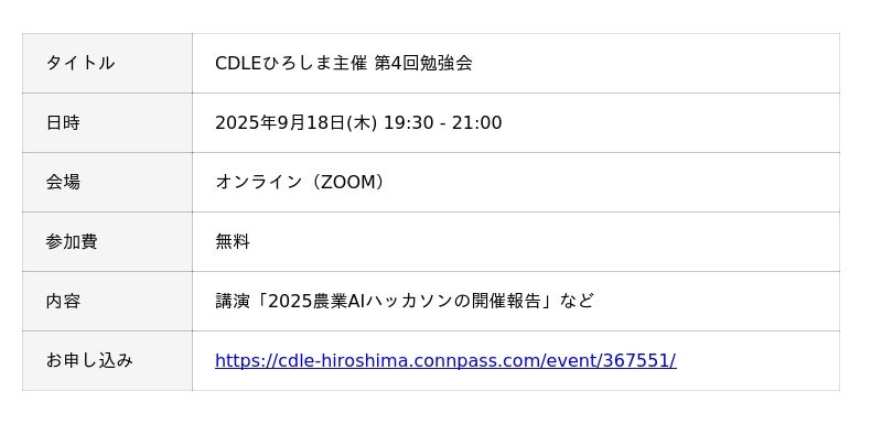 この度、Metagri研究所は、JDLAが運営するAIコミュニティである「CDLEひろしま」が主催する第4回勉強会にて、「2025農業AIハッカソンの開催報告」と題し、本ハッカソンの取り組み内容と成果、そして今後の社会実装への展望について発表いたします。