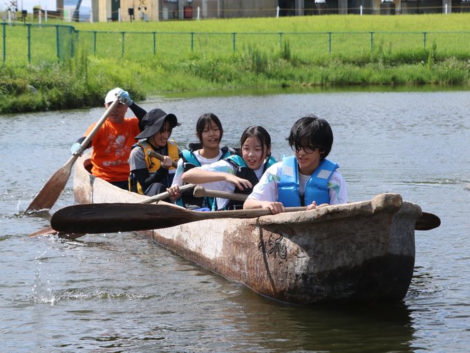 生徒たちは市指定樹木の「宮島杉」で作られた長さ7メートル、幅70センチ、重さ250キロの丸木舟「さくら丸」に乗り込んだ。歓声を上げながらかいをこぎ、縄文時代に思いをはせた。