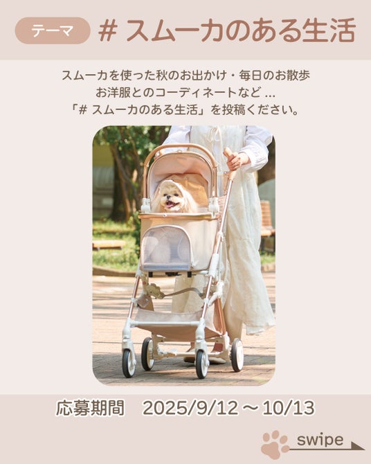 株式会社クリエイティブヨーコ(本社:長野県長野市 代表取締役社長:北原 武幸)が展開するペット用品専門ブランド『ペットパラダイス』は、秋のお出かけシーズンに向けて、愛犬・愛猫とオーナーが共に過ごす時間をより快適かつ安心して楽しんでいただけるよう、オリジナルペットカートブランド「スムーカ」の活用を提案します。9月12日(金)から、YouTubeでの商品紹介に加え、SNS投稿キャンペーン「#スムーカのある生活」をスタートし、ペットとのお出かけを応援していきます。