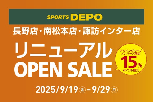 スポーツ用品販売の株式会社アルペン(本社:愛知県名古屋市、代表取締役社長:水野 敦之)は、スポーツデポ長野店・南松本店・諏訪インター店の3店舗を同時リニューアルOPENいたします。