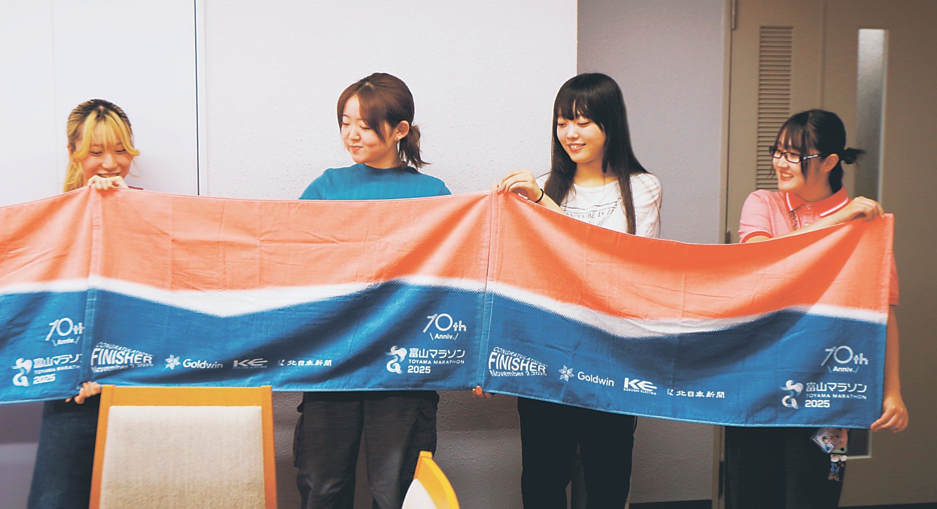 11月2日に行われる「富山マラソン2025」のランナーに贈られるタオルが完成した。富山大芸術文化学部の学生がデザインし、フルマラソンと車いすの部の完走者用と、ジョギングの部の参加者用の2種類を用意した。