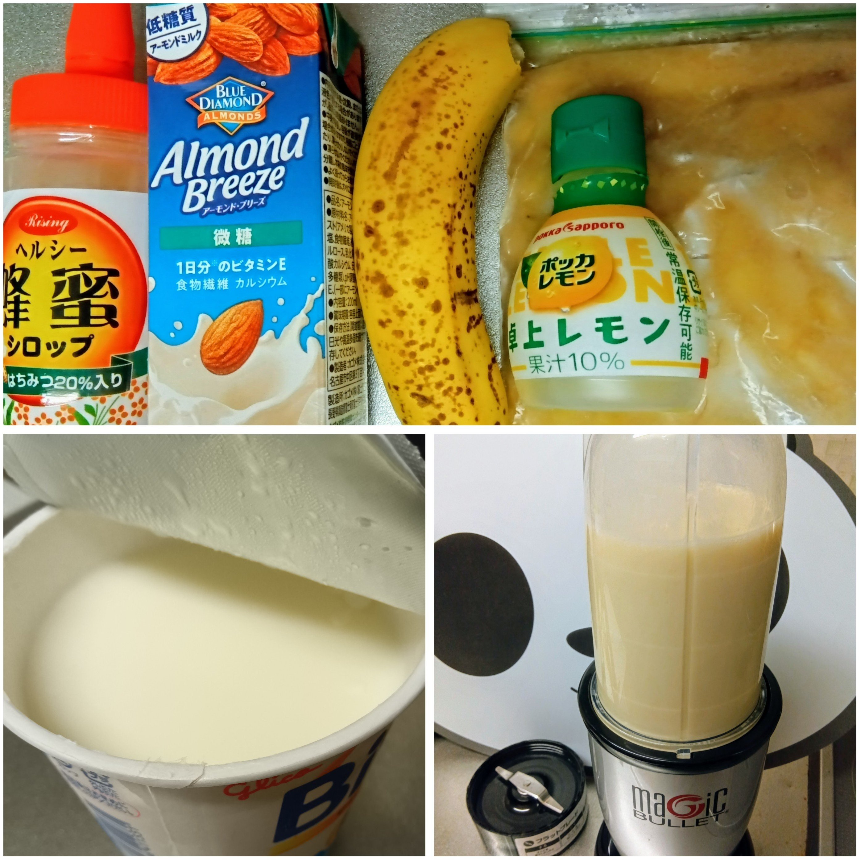 ブレンダーに③と牛乳やアーモンドミルクを入れてかき混ぜたら、バナナシェイクになります。お好みではちみつorバニラアイスorヨーグルトを加えると、もっとおいしいです💕