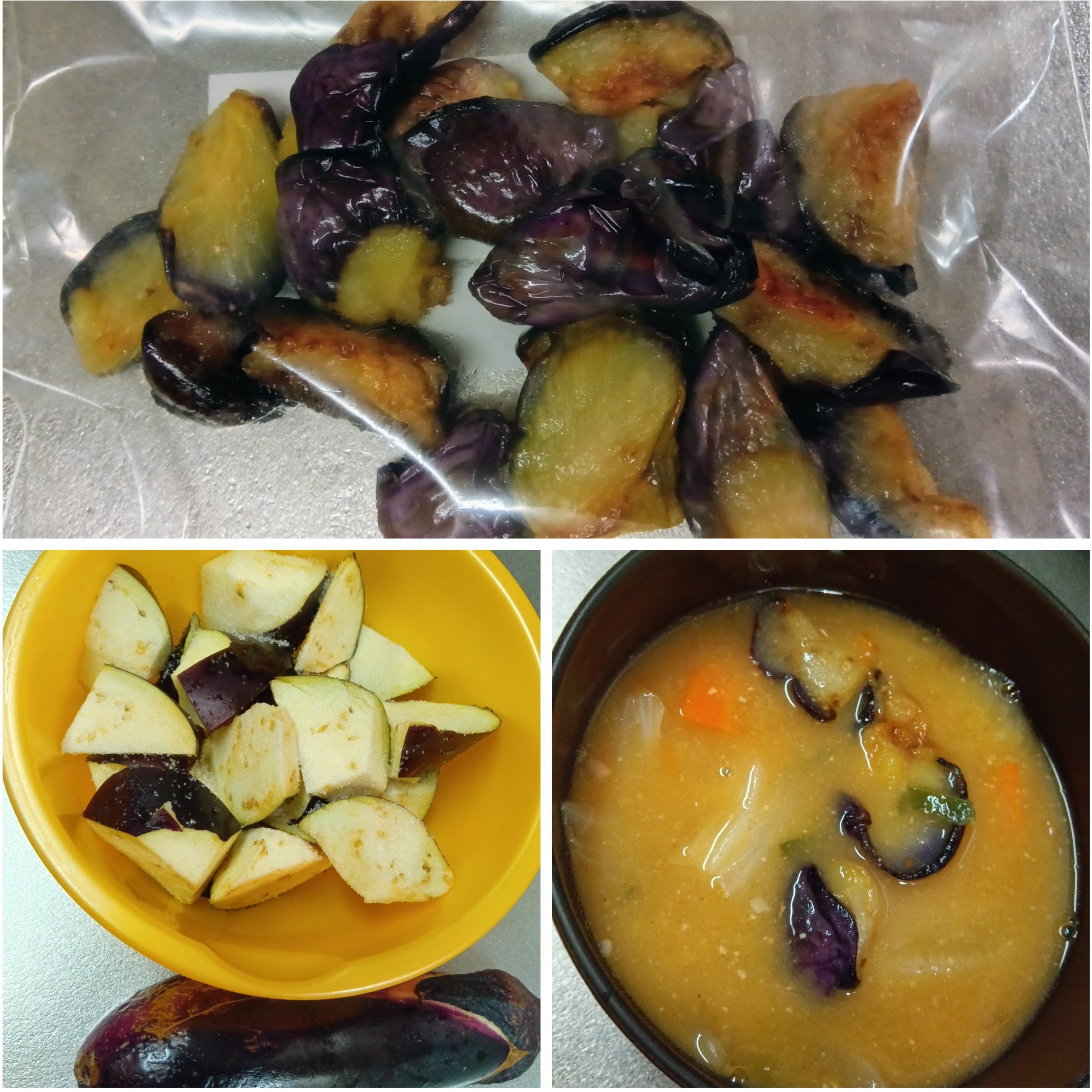 揚げナスにして冷凍します。使う時は解凍せずに、お味噌汁や煮物にそのまま投入し、加熱するだけ。