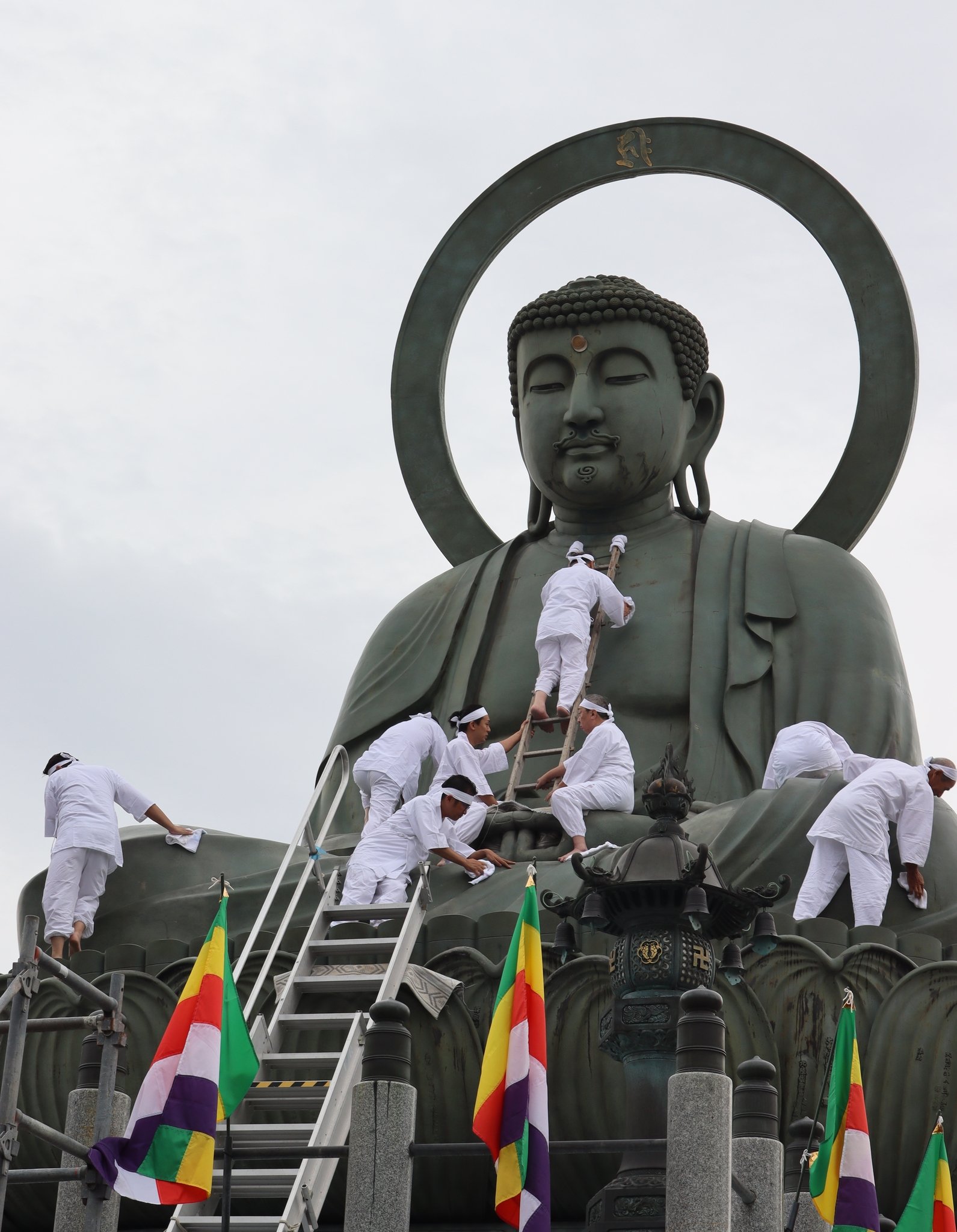 高岡大仏まつりに合わせて毎年行われている。北角良粋住職の読経の後、白装束に身を包んだ奉賛会員らが、はしごをかけて大仏像の顔や体を拭き、汚れやほこりを取った。