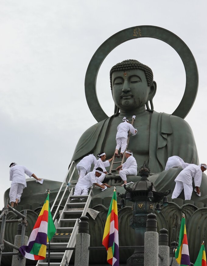 高岡大仏の「お身ぬぐい」が23日、富山県高岡市大手町の大仏寺であり、高岡大仏奉賛会のメンバーら15人がタオルで丁寧に拭き上げた。