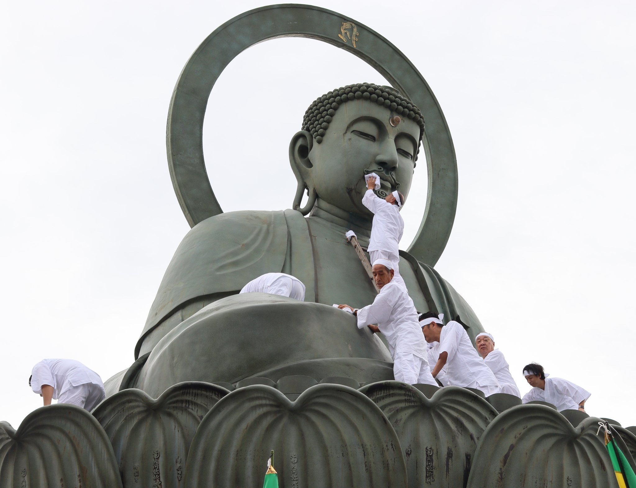 初めて顔を拭いたという定塚町2丁目町内会長の中川博之さん(74)は「一番上まで上って緊張した。こんなにじっくりと顔を見るのは初めて」と話した。奉賛会の向山耕司副会長(86)はお身ぬぐいに毎年参加していると言い「病気も入院もしていないのは大仏様のおかげ。来年も参加したい」と話した。