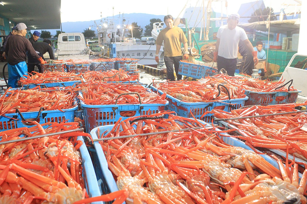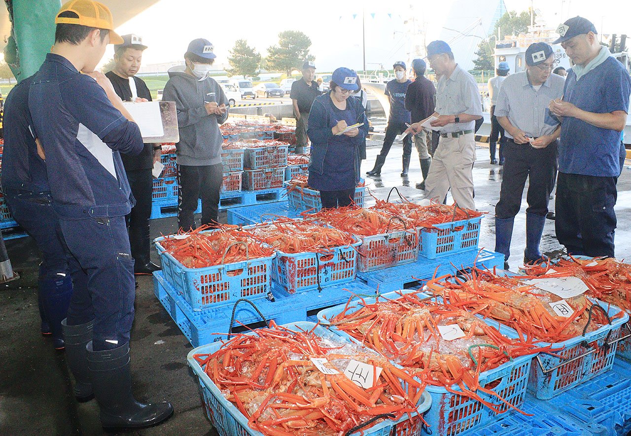 午前5時半ごろ、漁を終えた2隻が戻った。かごに山積みされたカニが次々に陸揚げされ、仲介人が競り落とした。「極上高志の紅ガニ」のブランド札が付いた上級品も並んだ。
