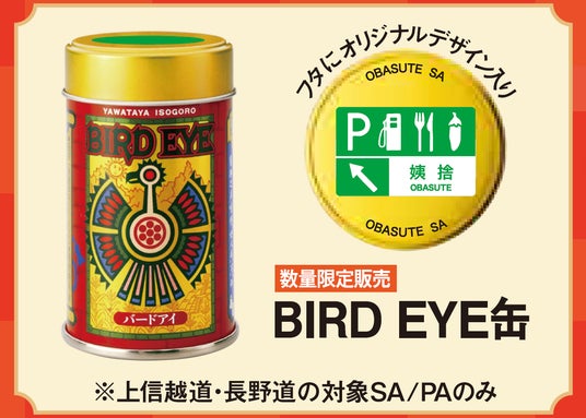 また、上信越道・長野道の対象エリアでは、SA・PAでは初の取扱いとなる直営店限定の人気商品『《根元 八幡屋礒五郎》BIRD EYE缶』を、ここだけでしか手に入らない高速道路限定オリジナルデザインのアニバーサリー缶として、数量限定販売いたします。