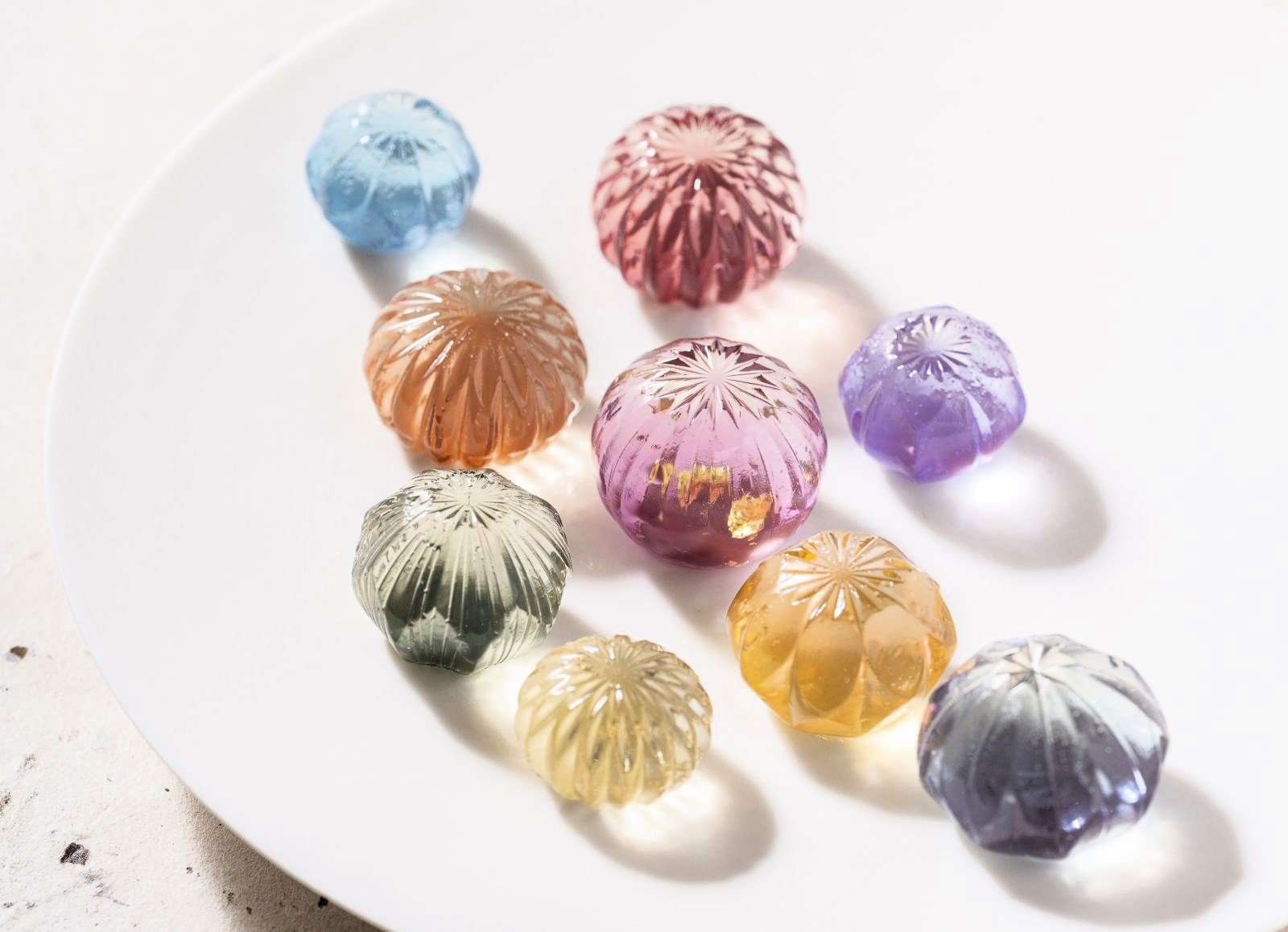 繊細なカットが施された、切り子ガラスのようなこの和菓子は、東京のガラス作家・山本真衣さんの作品「Breeze」(ブリーズ)を再現した生琥珀糖(こはくとう)だ。九つの色味に9種のカクテル。それぞれ味も香りも違う。リキュールやワインの香りが華やかな、甘いだけではない大人の味わいが特徴だ。