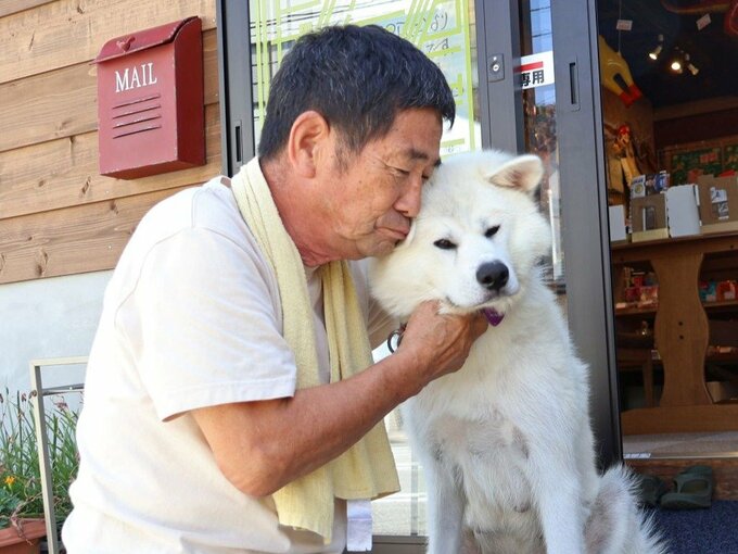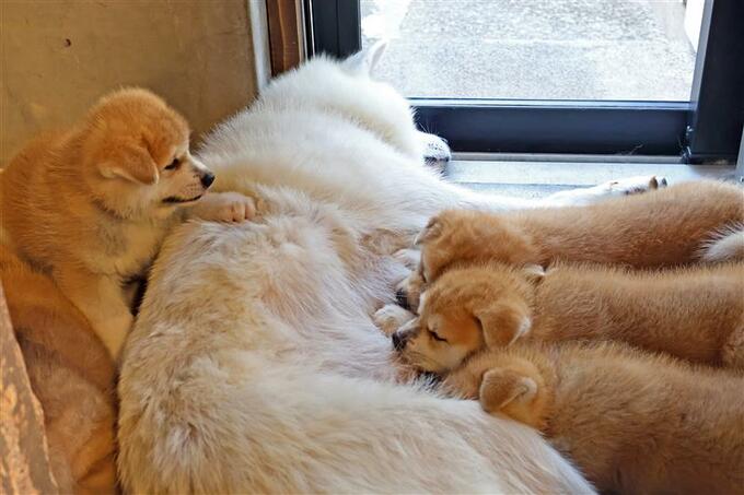 真っ白な秋田犬の「いめか」。穏やかな性格で、地域の人々に愛される駄菓子屋の看板犬だ。7月に7匹の子犬を生んだばかり。常連客は保護者のような目線で見守っているという。