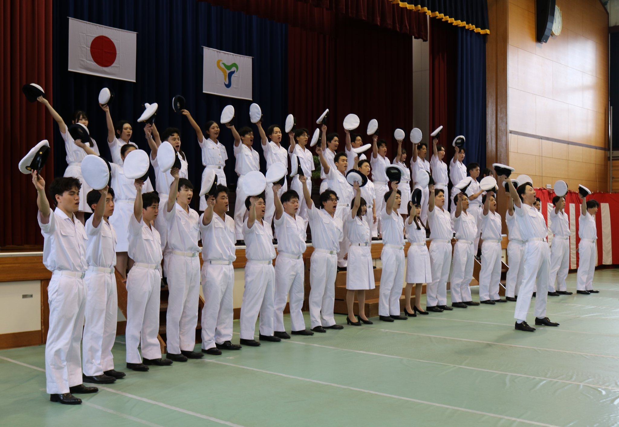 登しょう礼では、真っ白な制服を着た卒業生が帽子を誇らしげに投げていた。