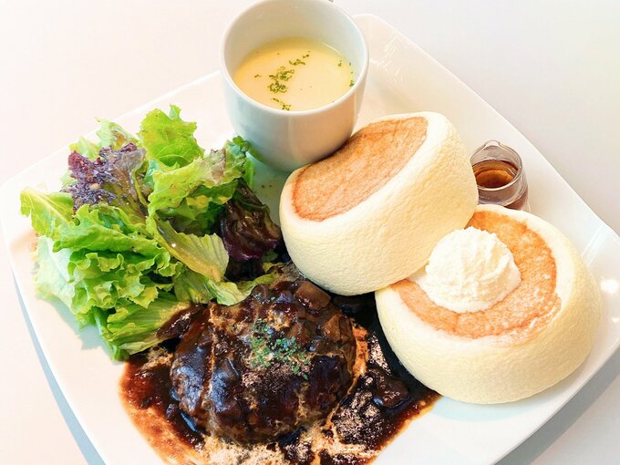 手づくりハンバーグとソースがついたお食事パンケーキ(1550円)は4種のソースからチョイス!