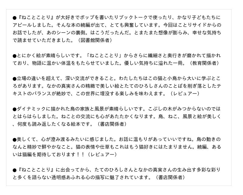 『ねことことり』は、子どもから大人まで多くの読者に愛され、「猫も、家の壁の木目も、本物みたい」(小学生)「紅茶の香りや花の匂いがする」(50代)「何度も読み返したくなる奥深さ」(30代)など、たくさんの共感の声が寄せられました。