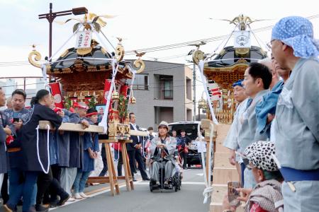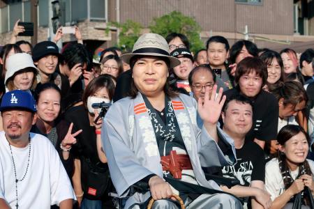 みこしパレードの出発式典にも参加。「回復祈願」の札が付けられたみこしに乗り、拍子木で一本締めを披露した。