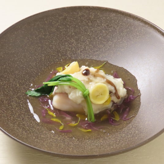 紅葉鯛ときのこの蕪蒸し 味噌上澄みの菊花餡 銀杏