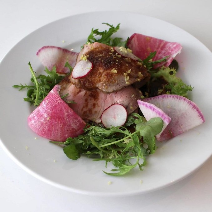 「国産豚肩肉のローストポーク 柑橘と玉ねぎソース」