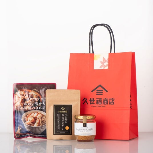 炊きたてごはんにぴったりの「大人のしゃけしゃけめんたい」や、旨みたっぷりの「粉末万能だし」など、久世福商店自慢の逸品を贅沢に詰め込みました。