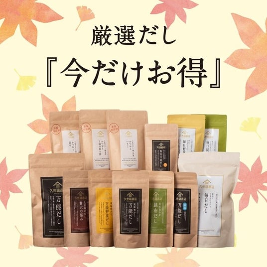 店舗では、10月20日(月)より10月26日(日)の期間、対象商品を2個ご購入で5%OFF、3個以上ご購入で10%OFFの、お得なだしのセールを実施。公式オンラインショップでは、同時期に対象商品が単品5%OFFのお得なだしセールを実施。