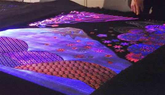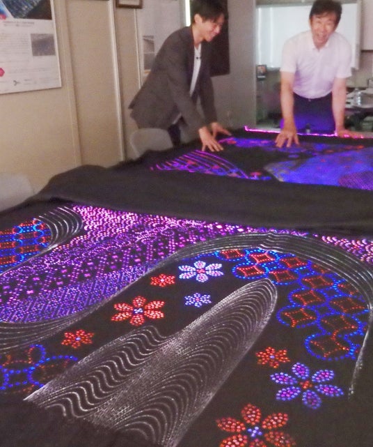 万博会場での体験型展示「未来航路―20XX年を目指す中小企業の挑戦の旅」は、中小企業基盤整備機構と中小企業庁が企画・運営し、選ばれた全国84社が各々の技術力を来場者にアピールする場で、万博のEXPOメッセSouthを会場に10月3日~7日に開催される。このうち、大喜の発光タペストリーは「伝統の継承と革新」エリアで展示される。タペストリーの大きさは縦1.4メートル、横1.1メートル。ひとつは富士山柄で、富士山を中央に、和の面持ちをイメージした桜、梅、牡丹、さらに金箔などの文様をあしらった一見、浮世絵風のデザイン。もう一点は天の川や唐草、江戸小紋をドット柄で描いたもの。いずれも伝統とデジタルを融合させたもので、原画は吉澤さんがデザインした。