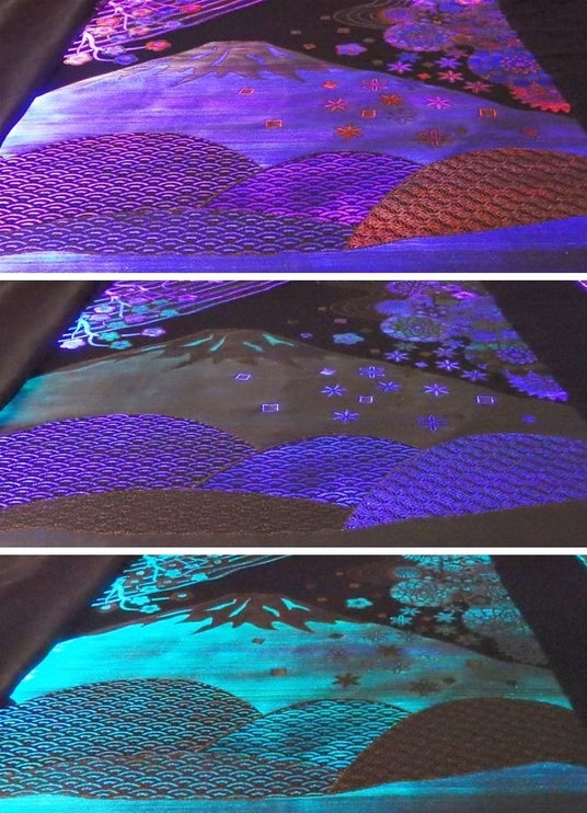 【上から順次下へ】発光ジャカード織物技術による「富士山柄」。光源のプログラムによって、模様の光り具合が、レッドから徐々にブルー、グリーンと徐々に変化したり、部分的に光ったりする
