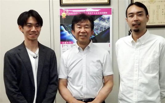 発光ジャカード織りの新作に取り組んだ山本岳由社長(中央)とデザイナーの吉澤さん(右)、左は開発担当の山本崚太さん