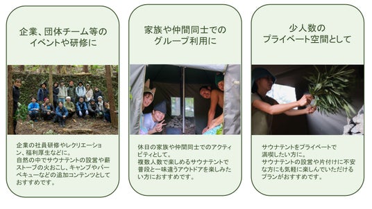 「自然の中で人目を気にせずに楽しみたい」「サウナ施設の混雑から避けたい」などのお悩みに応え薪火によるストーブ、ロウリュ、大量のミストで極上のサウナ体験を提供します。