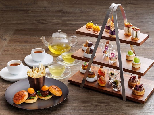 高さ9mのパノラマウィンドウが特徴のダイニングにて、4種類のセイボリーと6種類のスイーツ、ミニハンバーガーを楽しめる軽井沢 浅間プリンスホテルオリジナルのアフタヌーンティー。