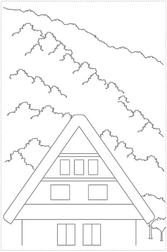 「あなたもセツさん 新聞ちぎり絵に挑戦」の15回目は、合掌造りです。下絵を切り取り、ハガキなどに貼って使ってください。