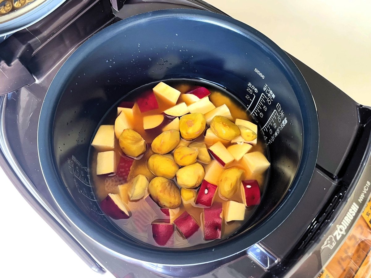 ③炊飯器に米・しょうゆ・みりん・酒・塩・水を入れ、上に栗とさつまいもをのせて炊く。