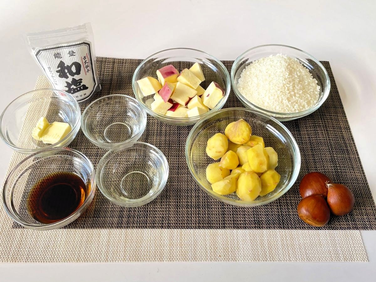 ホクホクの栗と甘いさつまいもを炊き込みごはんにして、仕上げにバターとしょうゆで香ばしくまとめました。