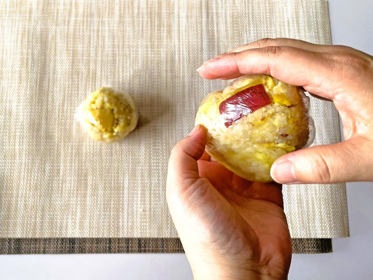 今回は秋の味覚、栗とさつまいもをたっぷり使った親子おにぎりです。