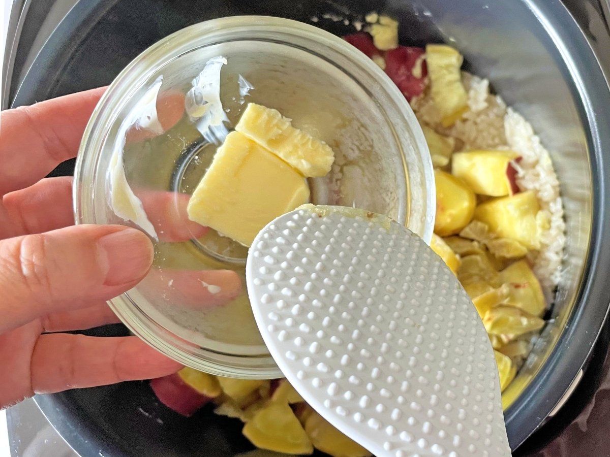 ④炊き上がったら熱いうちにバターを加え、全体をふんわり混ぜる。