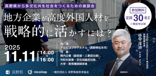 総合人材サービスのパーソルグループで人材派遣・アウトソーシング事業を手掛けるパーソルテンプスタッフ株式会社(本社: 東京都渋谷区、代表取締役社長: 木村 和成、以下パーソルテンプスタッフ)は、一般社団法人nicollapが長野県より受託した「海外IT人材獲得支援事業」の一環として、2025年11月11日(火)に高度外国人材の活用をテーマとした座談会を開催します。