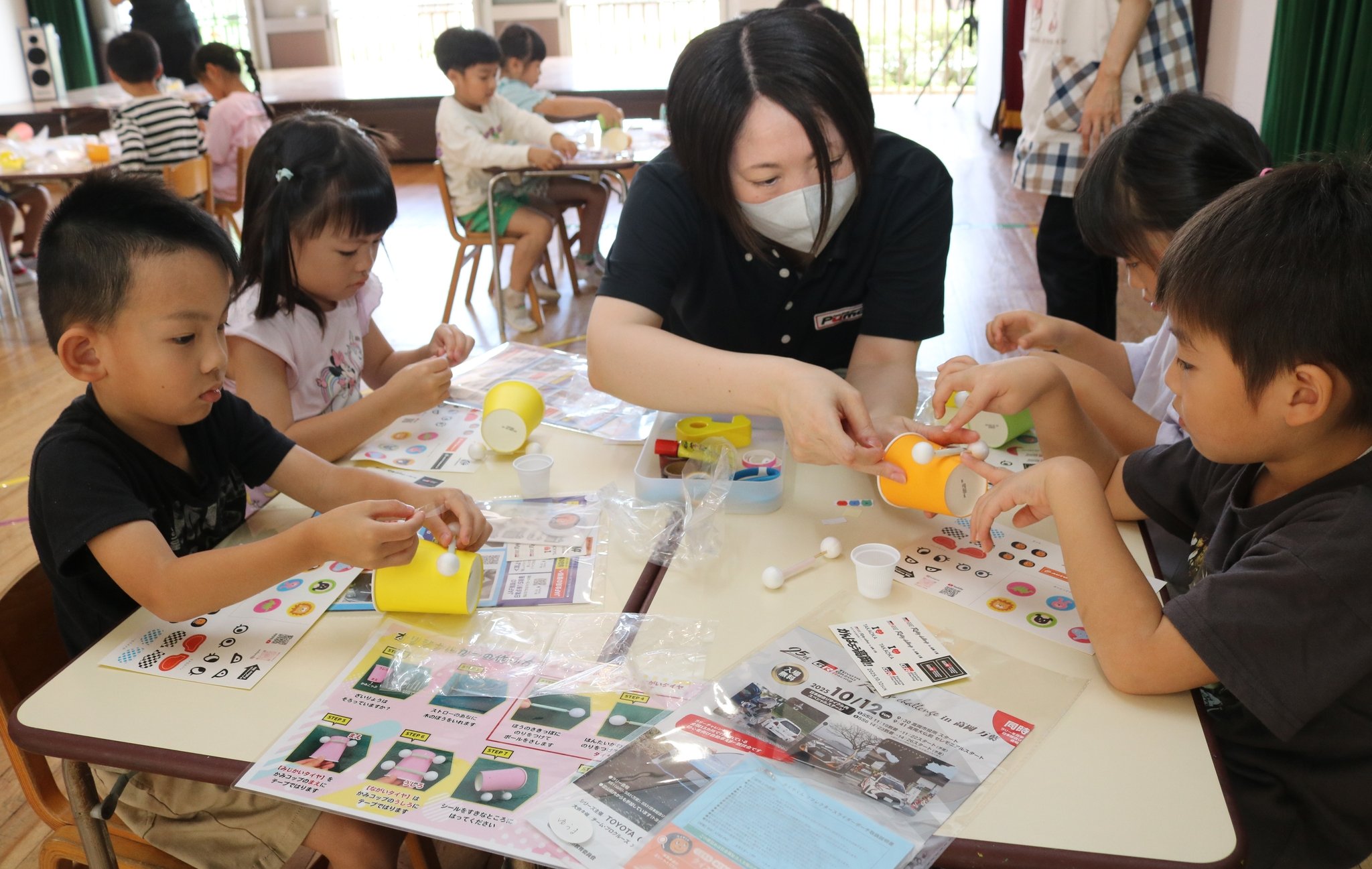 子どもたちに車の楽しさを伝えるイベントが3日、富山県高岡市伏木本町の伏木保育園であり、園児が紙コップを使った車の工作やラリーカーの乗車を楽しんだ。