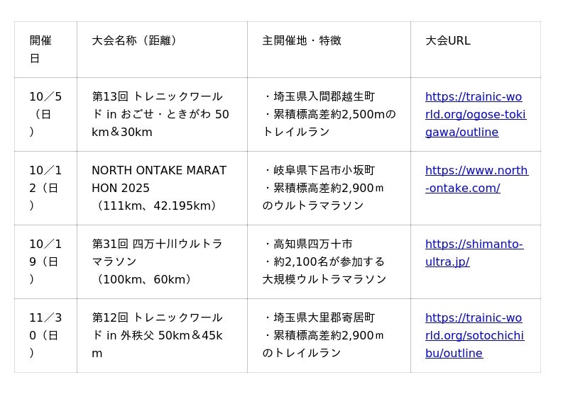 10月~11月に全国各地で開催されるウルトラマラソンやトレイルランの大会から、下記の4つのウルトラマラソン大会、トレイルラン大会に相次ぎ協賛し、参加者や入賞者に当社のアスリート向けプロテインバー「ストロングバー」約3,500本の提供などを行い、激走を支援します。