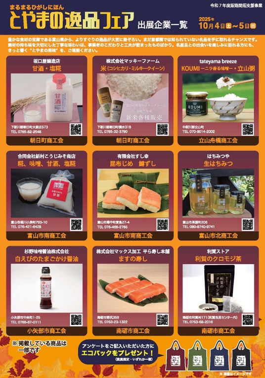 まるまるひがしにほんでは、10月4日(土)・5日(日)「とやまの逸品フェア」を開催します。